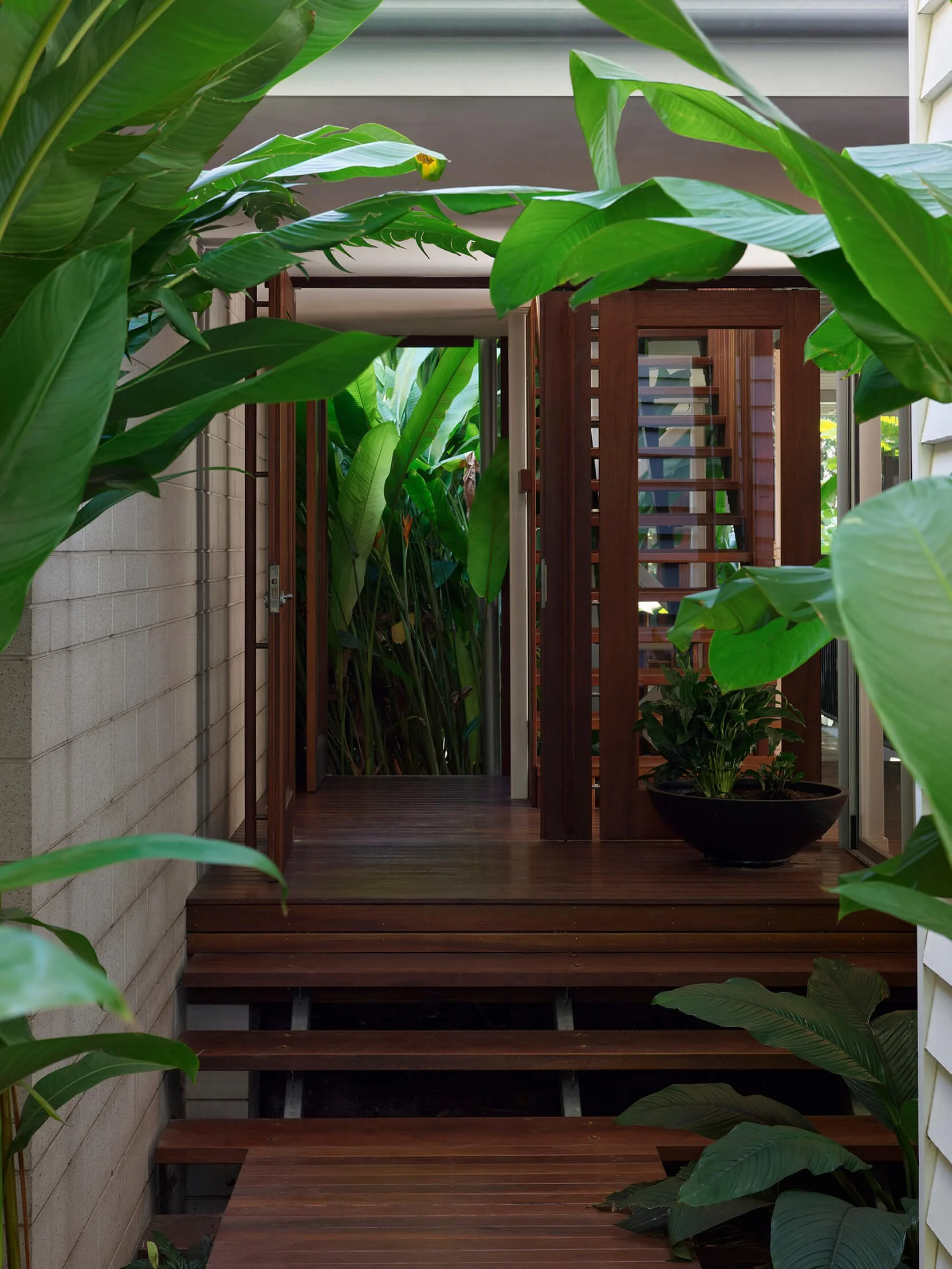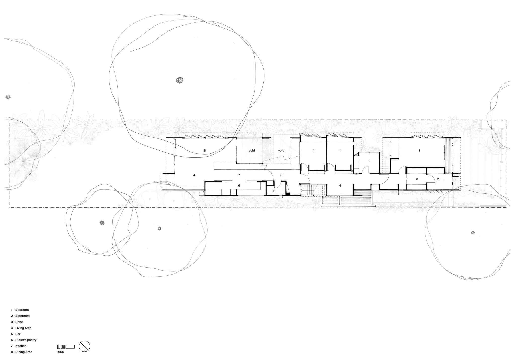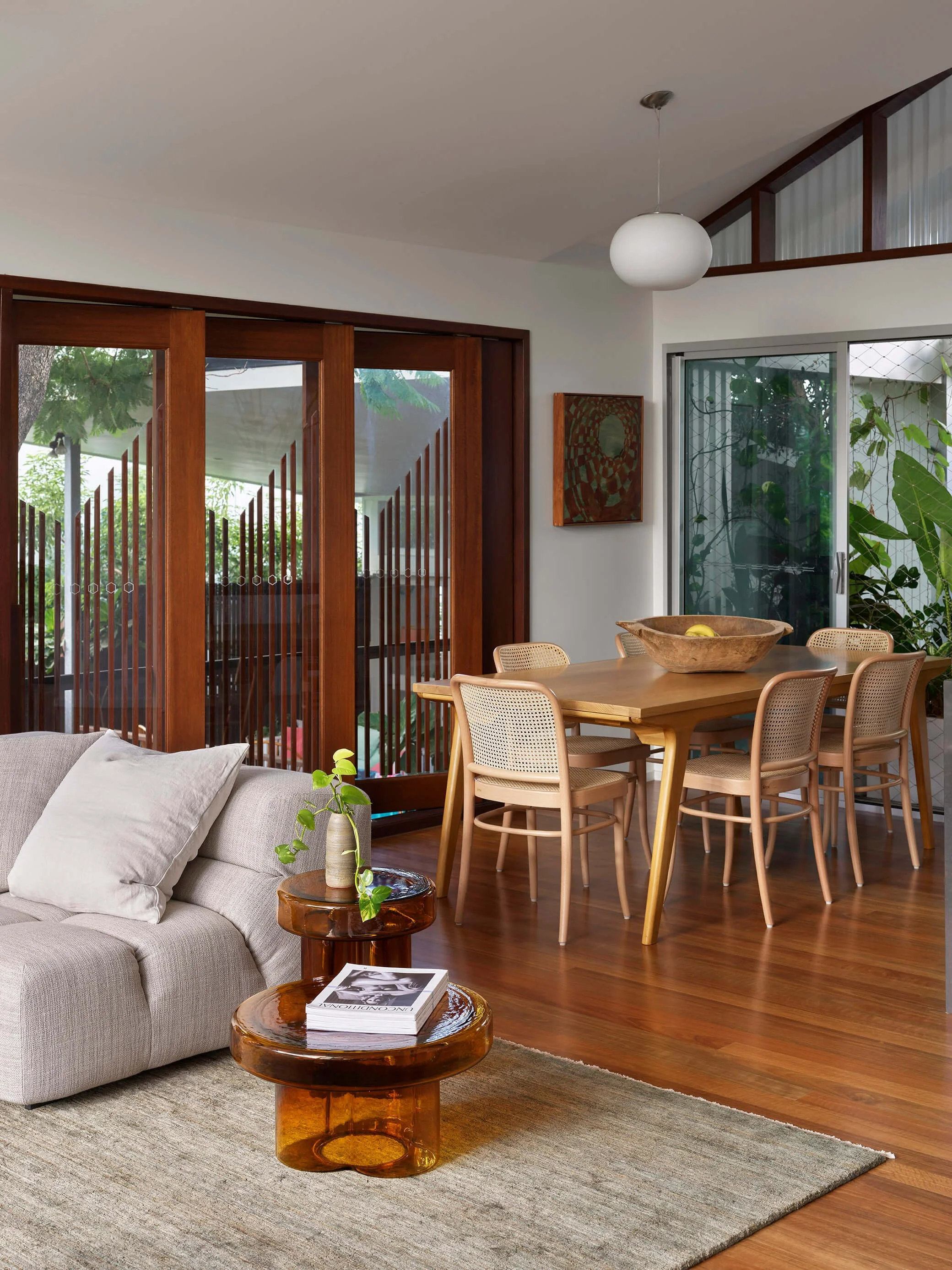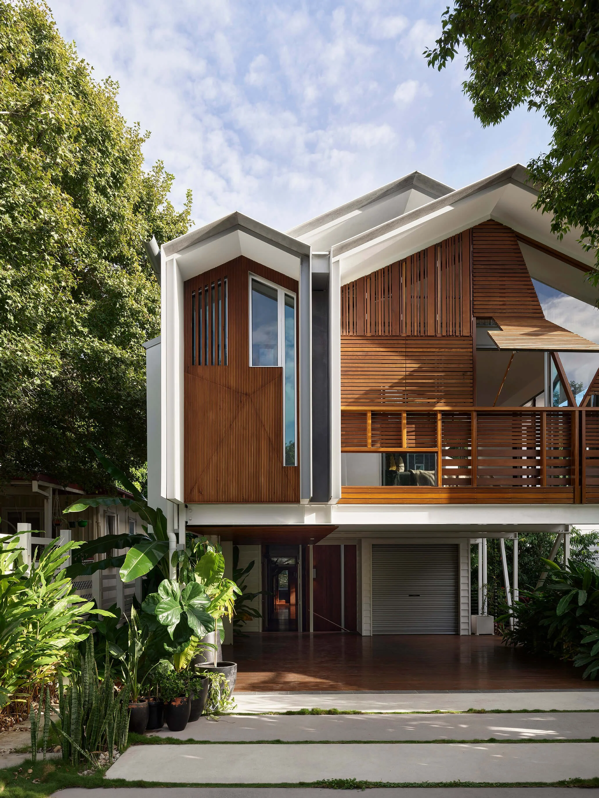 To mitigate flood constraints, the lower level is raised 1.8 metres above ground and comprises a series of open decks and immersive spaces that allow the landscape to permeate the house, blurring the lines between inside and out. The upper level is more enclosed, yet still maintains a strong connection to the outdoors. Nestled amid the tree canopy, it has high ceilings and operable glazing that offer generous views of greenery and cross ventilation. The floor plan is stepped apart into three connected pavilions, allowing the living and sleeping wings to be closed when unoccupied, inspiring family interaction in the shared spaces.