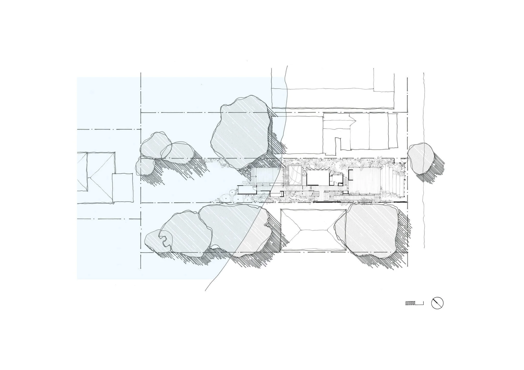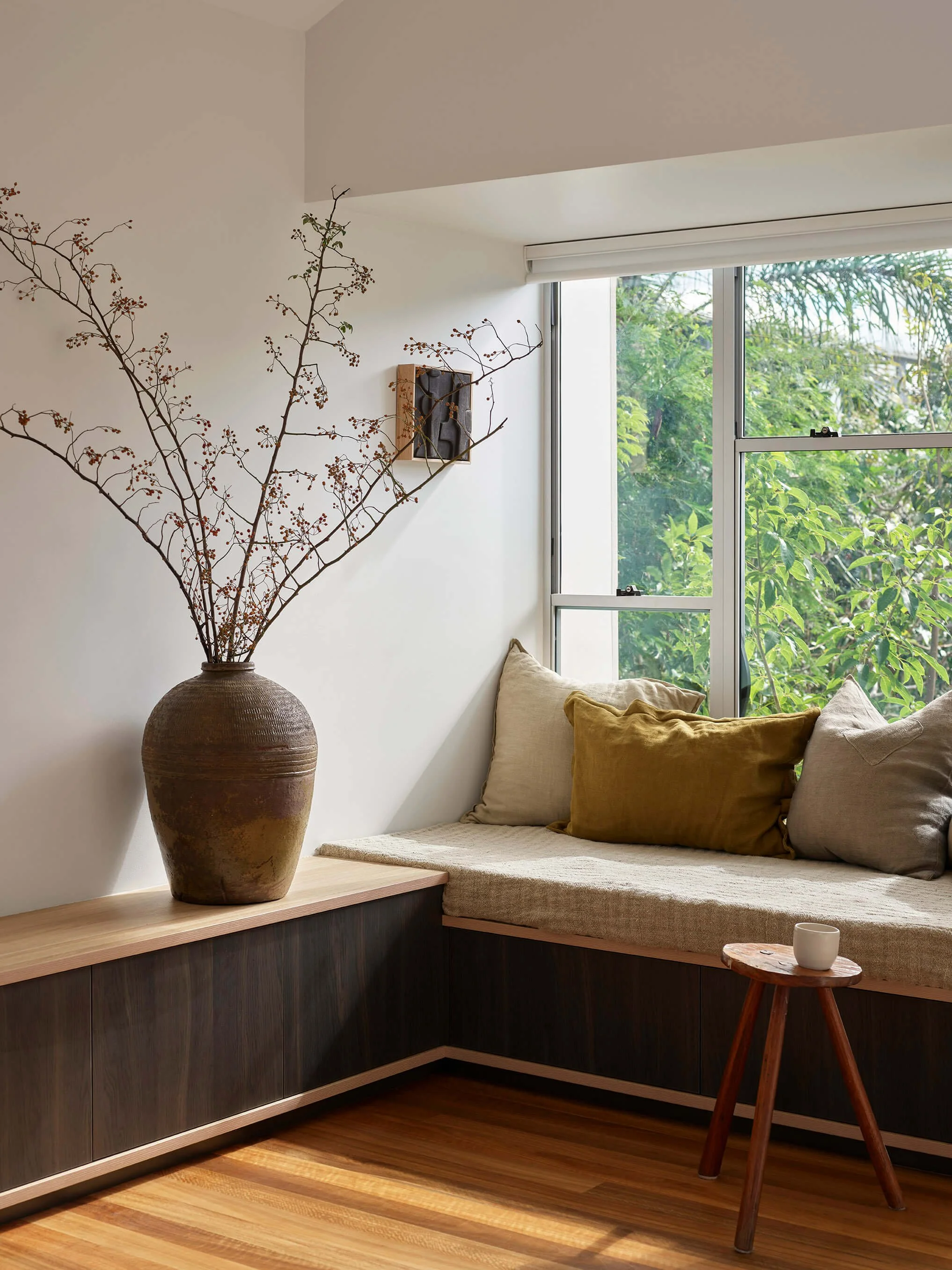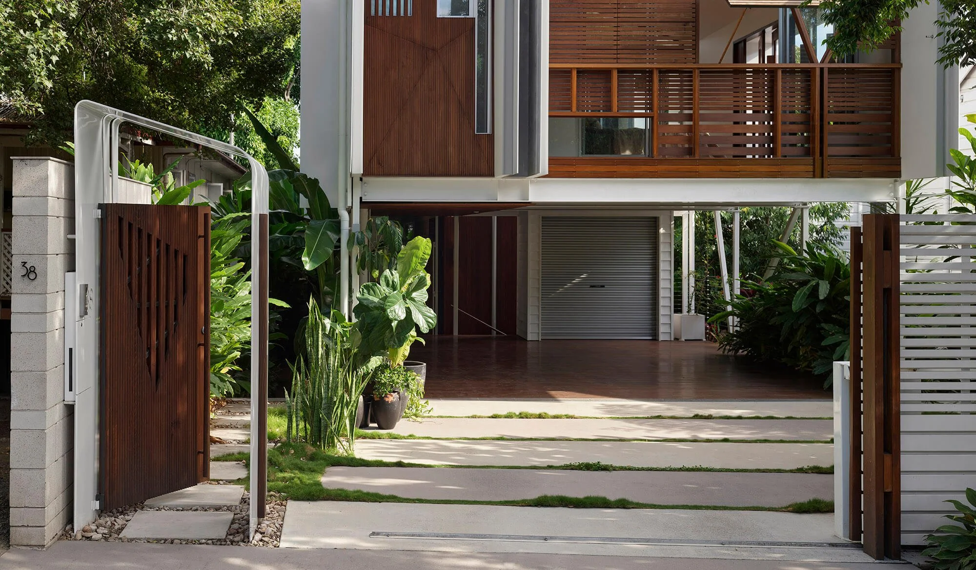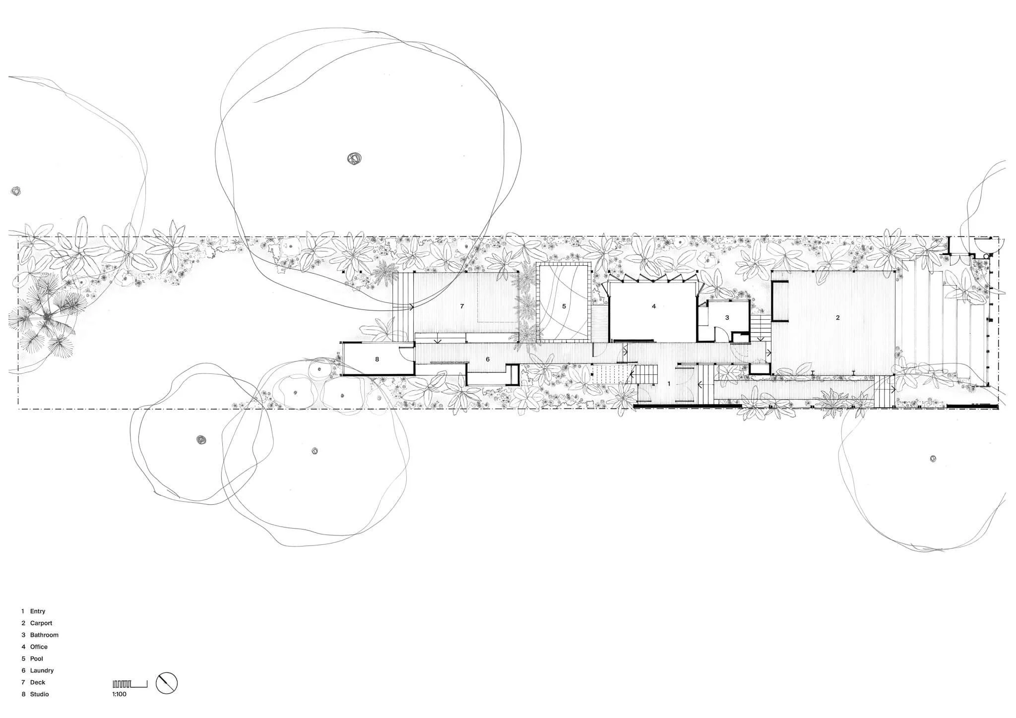 To mitigate flood constraints, the lower level is raised 1.8 metres above ground and comprises a series of open decks and immersive spaces that allow the landscape to permeate the house, blurring the lines between inside and out. The upper level is more enclosed, yet still maintains a strong connection to the outdoors. Nestled amid the tree canopy, it has high ceilings and operable glazing that offer generous views of greenery and cross ventilation. The floor plan is stepped apart into three connected pavilions, allowing the living and sleeping wings to be closed when unoccupied, inspiring family interaction in the shared spaces.