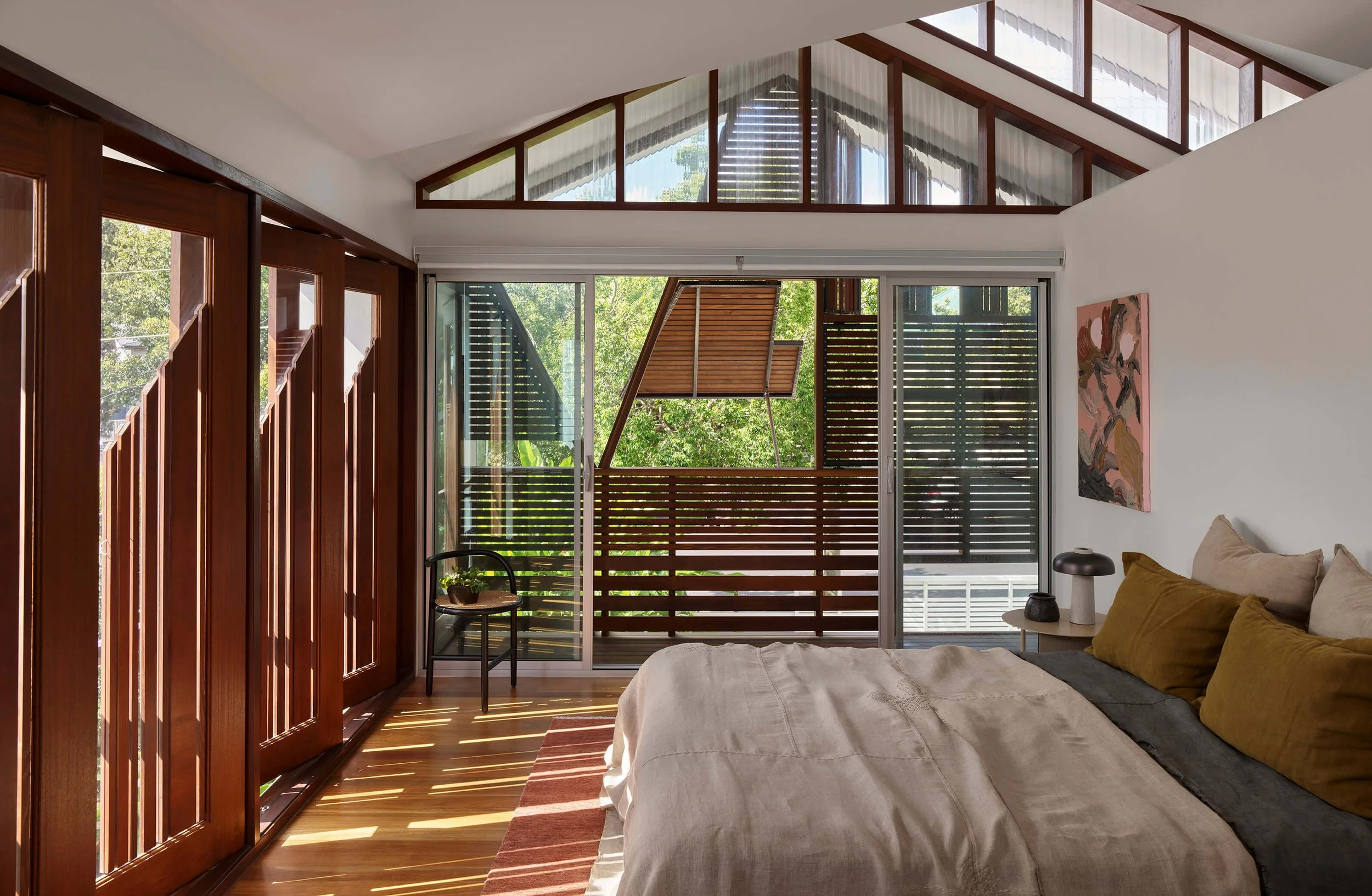 Main bedroom. Timber applied to the doors on the north allow for privacy to the neighbouring house, which is close to the boundary. Ventilation balcony to the far end with the busy street beyond.
