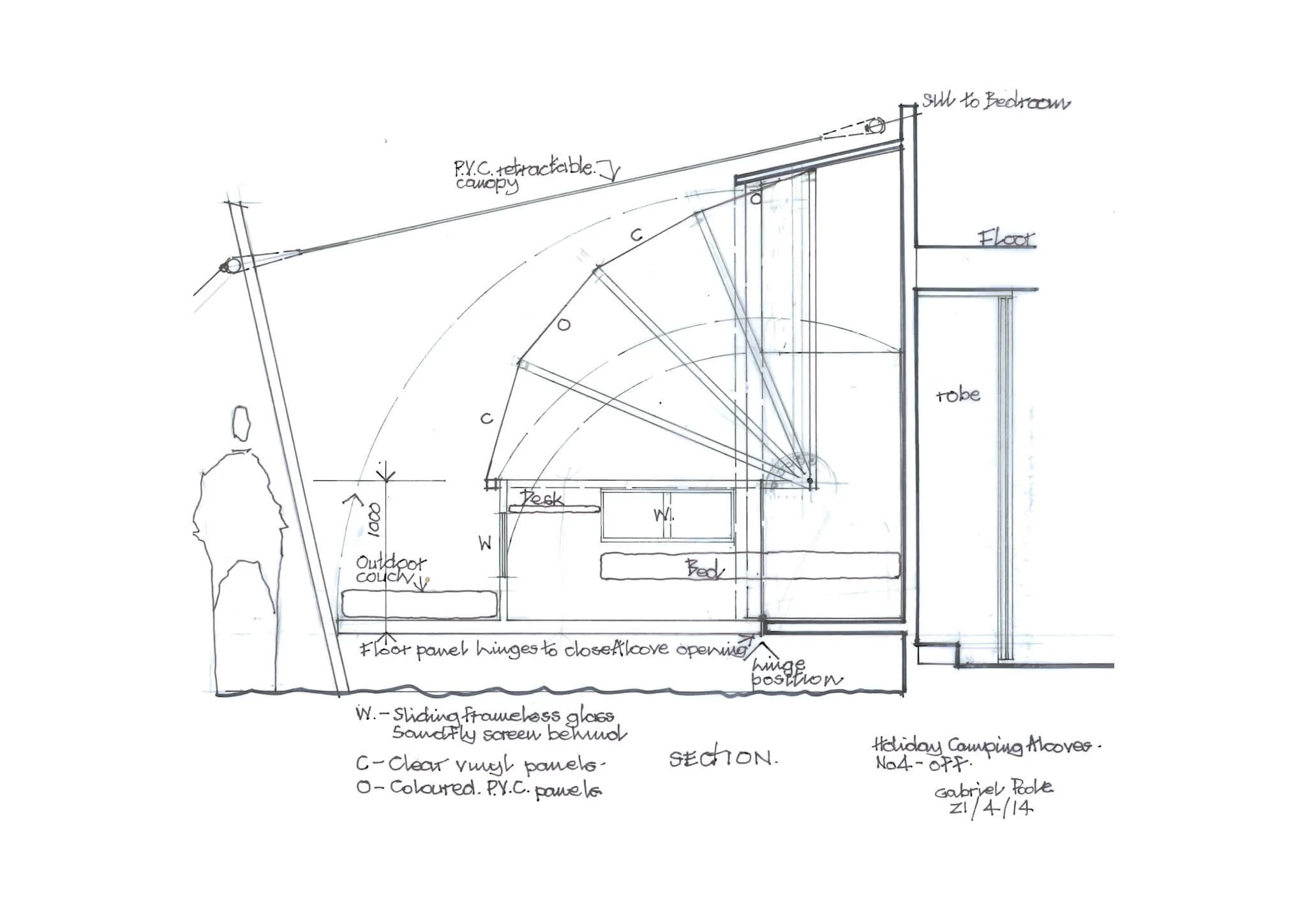 Detail drawing showing the mechanism of retractable alcoves, drawn by Gabriel Poole.