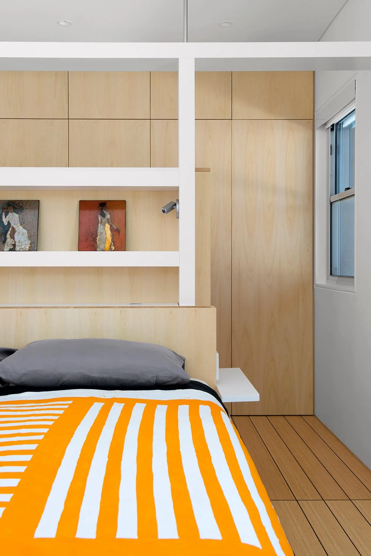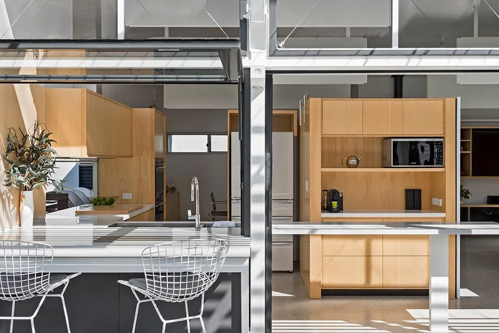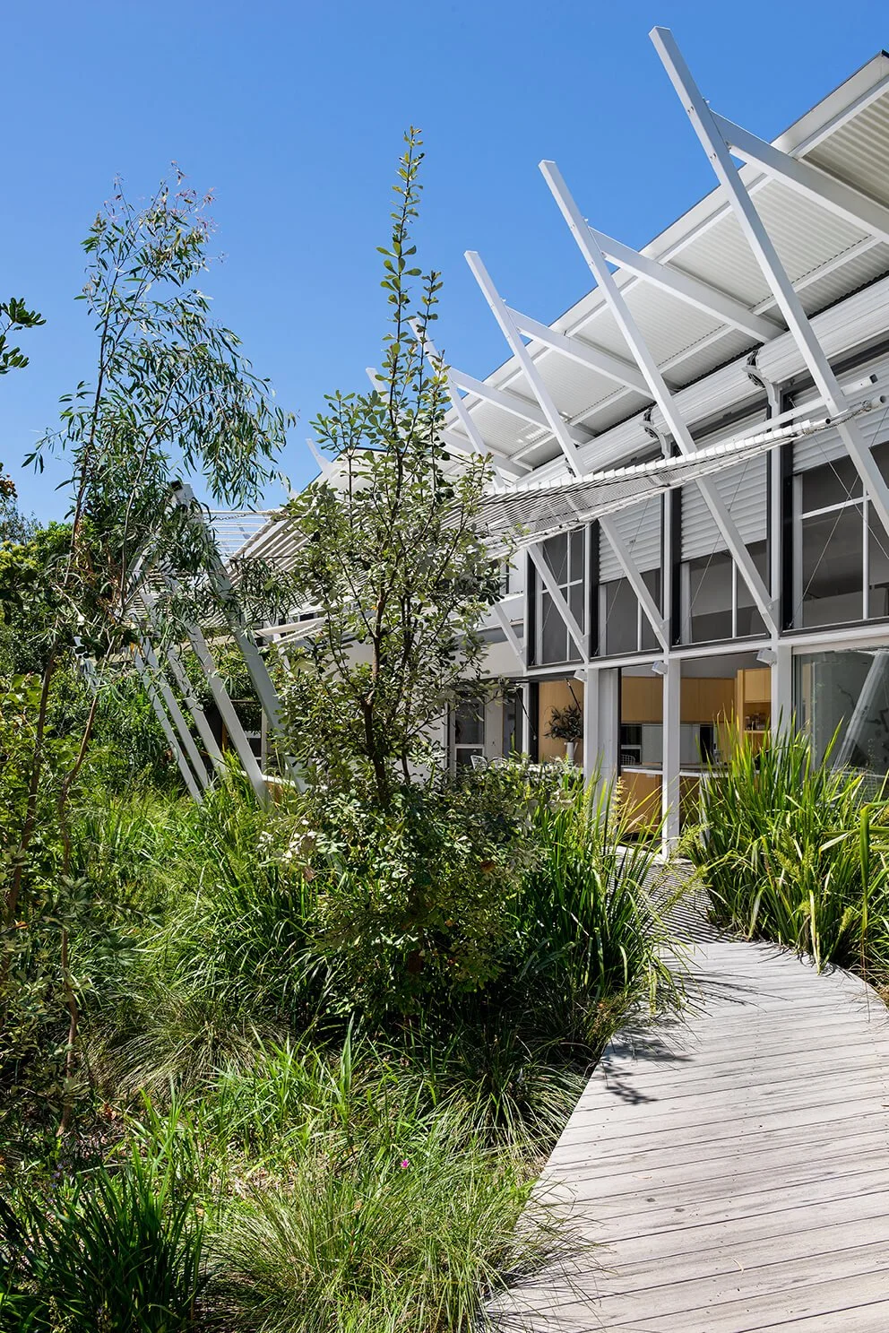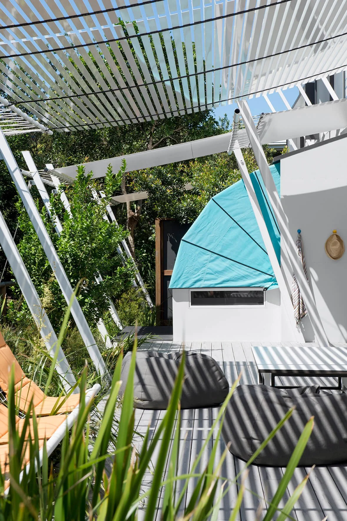The expressive, exuberant house comprises two steel-framed pavilions linked by a breezeway. The single-storey western pavilion has an open-plan living, kitchen and dining area extending out to a northern verandah. The two-storey eastern pavilion accommodates the bedrooms and bathrooms. On the ground floor, the exterior walls of the twin rumpus rooms fold down to create four canvas-roofed sleeping pods that evoke the experience of camping. Upstairs, three bedrooms are connected to the ground floor via an internal staircase and an external water slide.