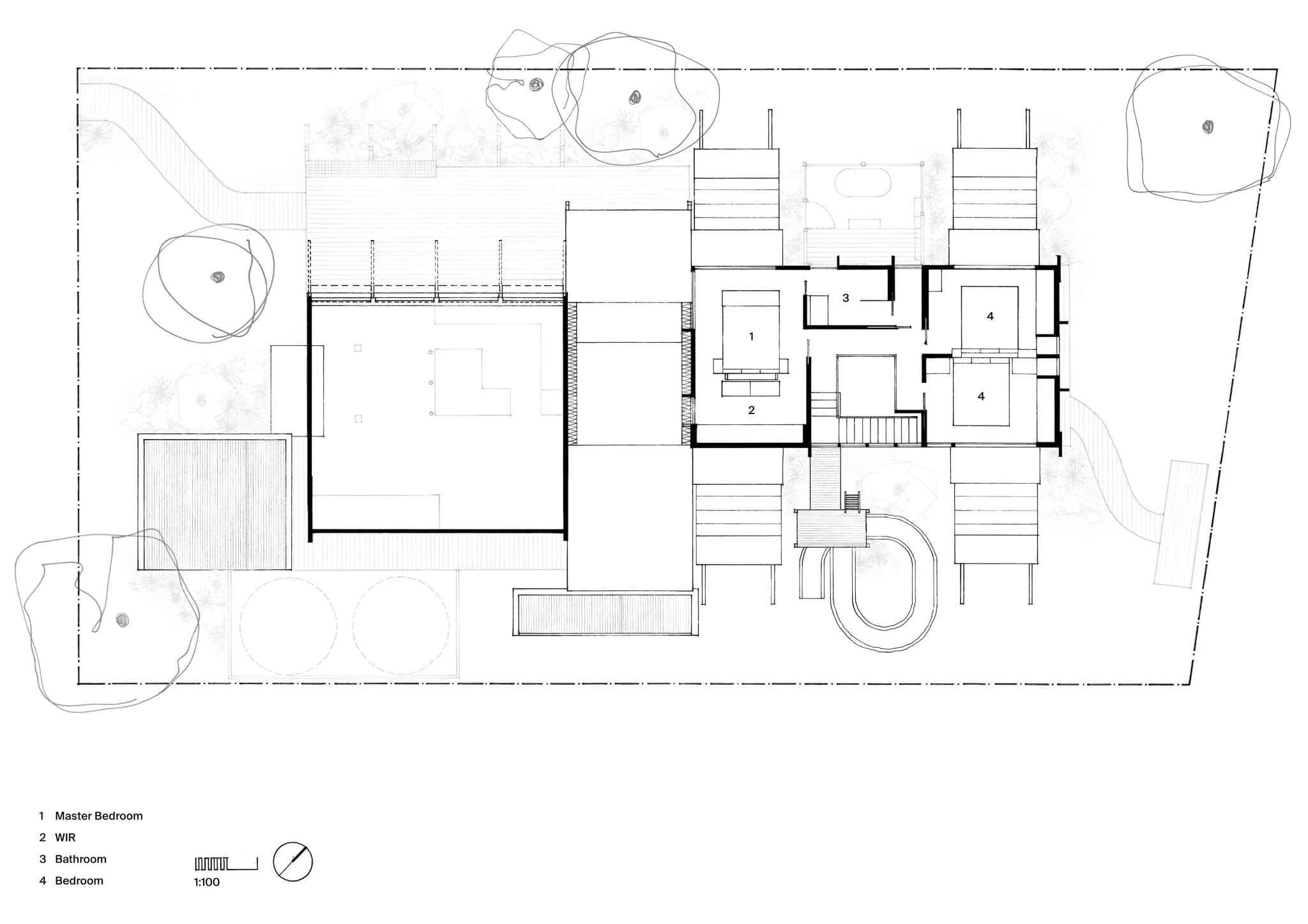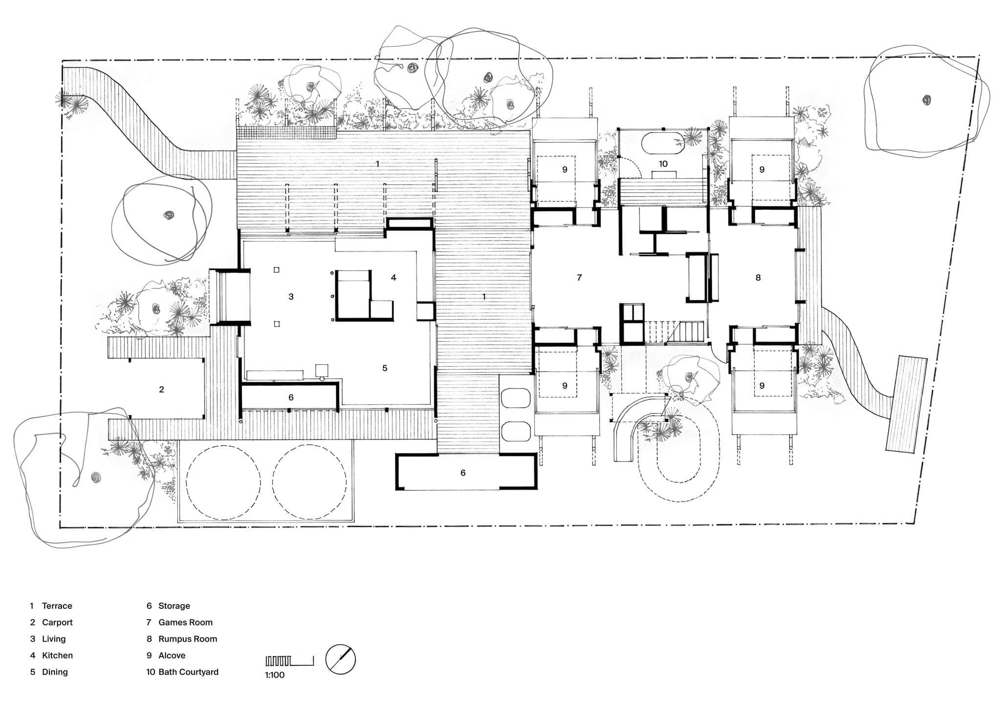 Lower Floorplan. The house is split into two pavilions. A single-level living pavilion toward the beach (west) and a double-storey sleeping pavilion to the east. They are connected by a breezeway.