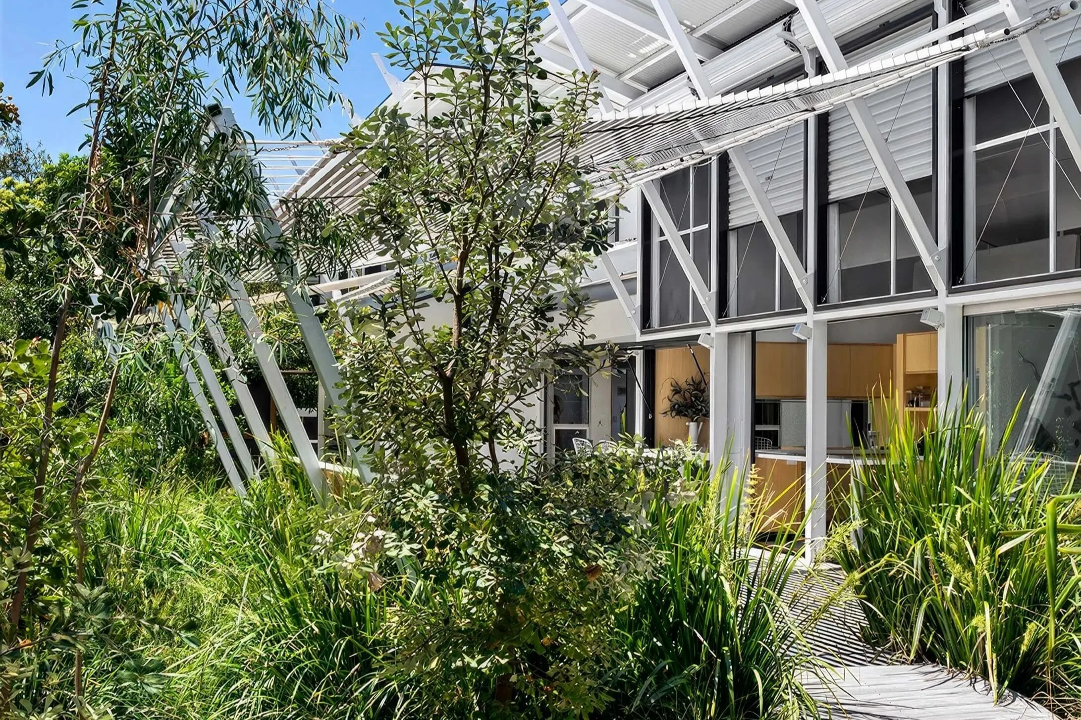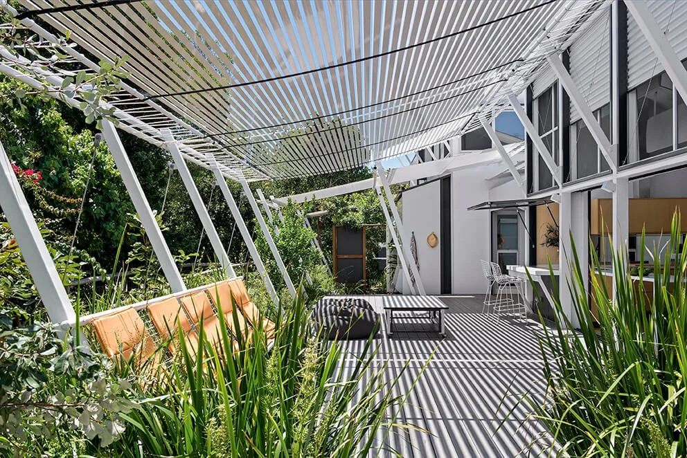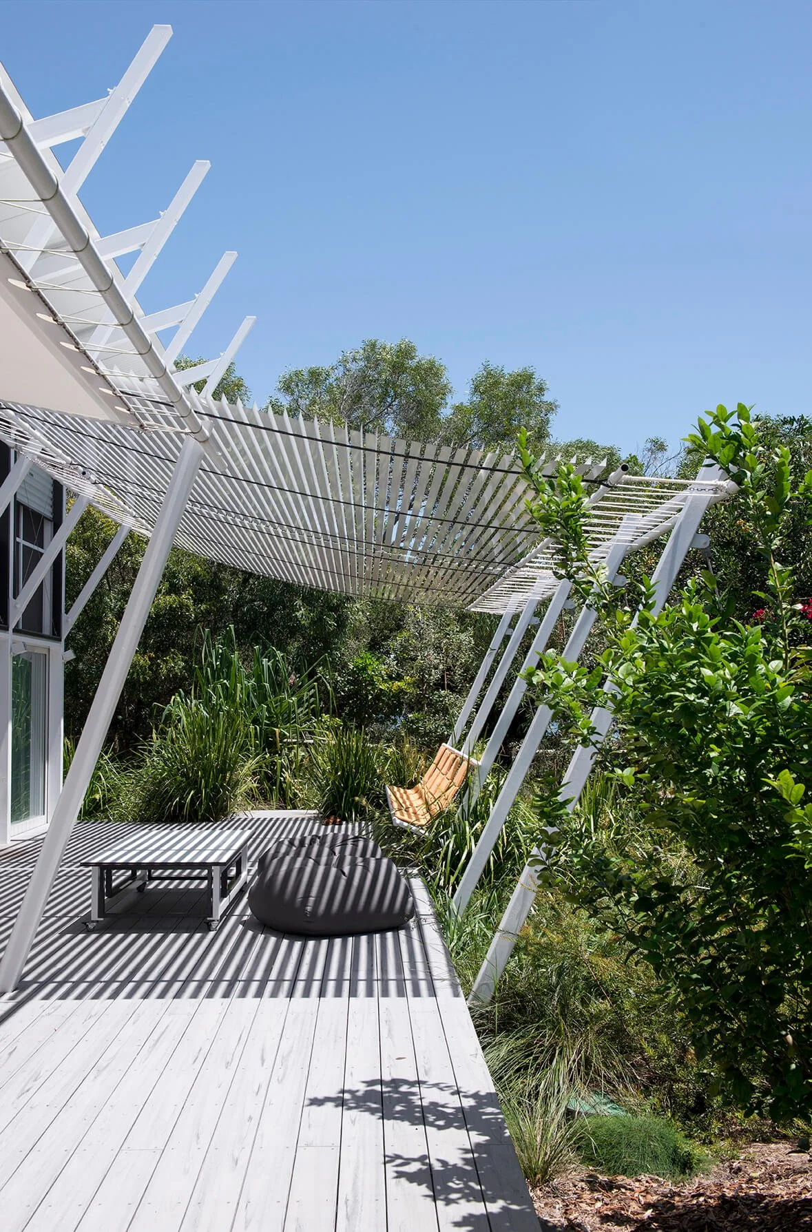 The house is constructed with a lightweight, custom-steel fabrication. Portal frames have raking arms that extend up and beyond the roof line, like tent poles. The verandah awning stretches across the deck to leaning steel columns with built-in hammock seating suspended over the landscape.