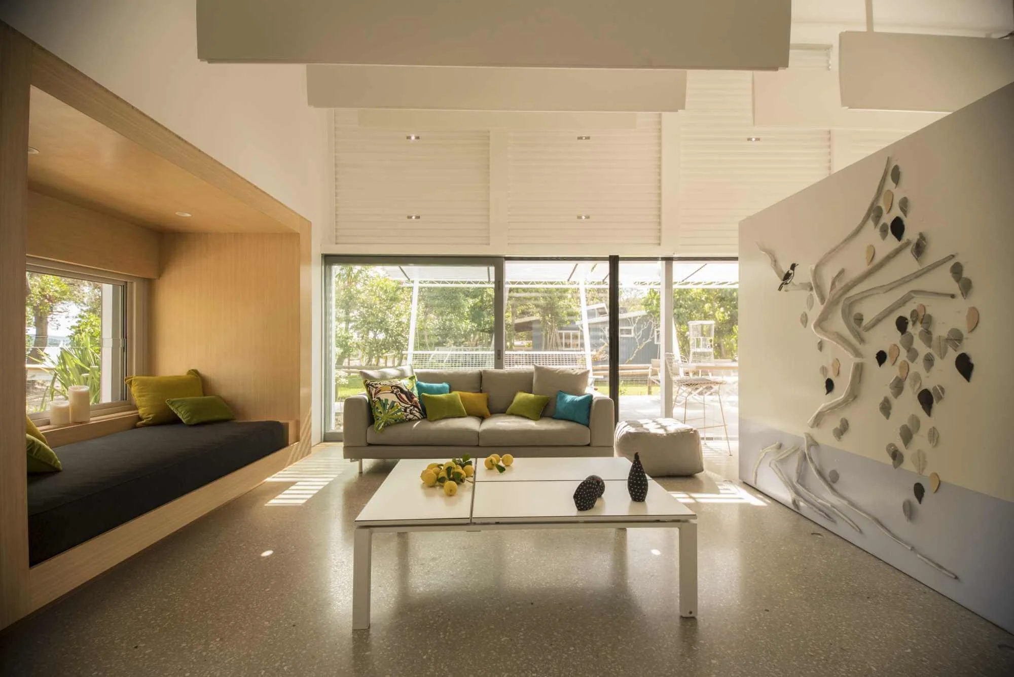 Living room, daybed alcove to left. 'Tree of Life' wall sculpture by Elizabeth Poole at right.