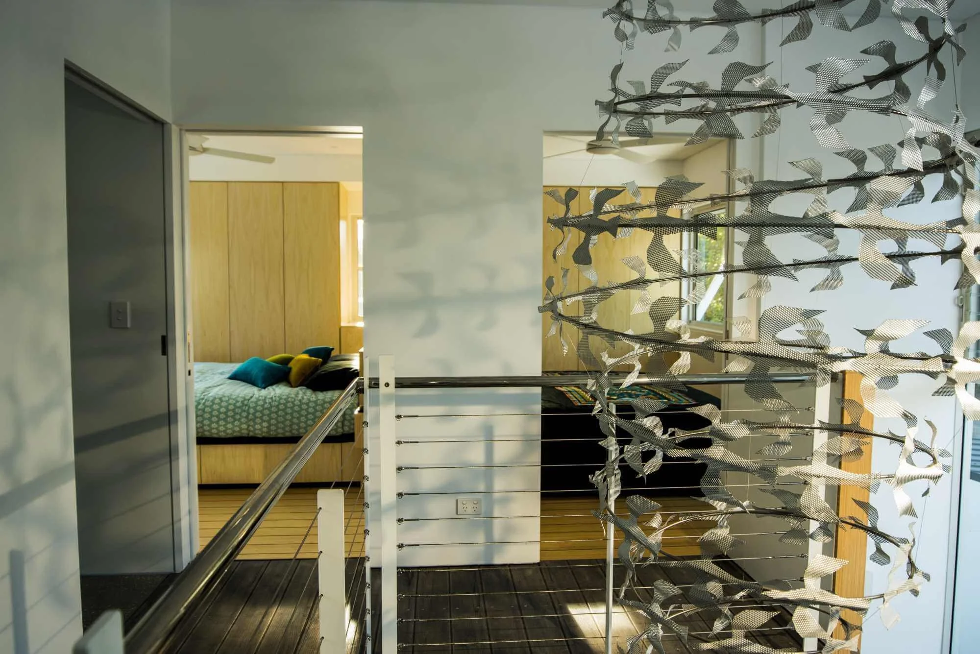 Upper level sleeping areas, hanging bird sculpture by Elizabeth Poole.