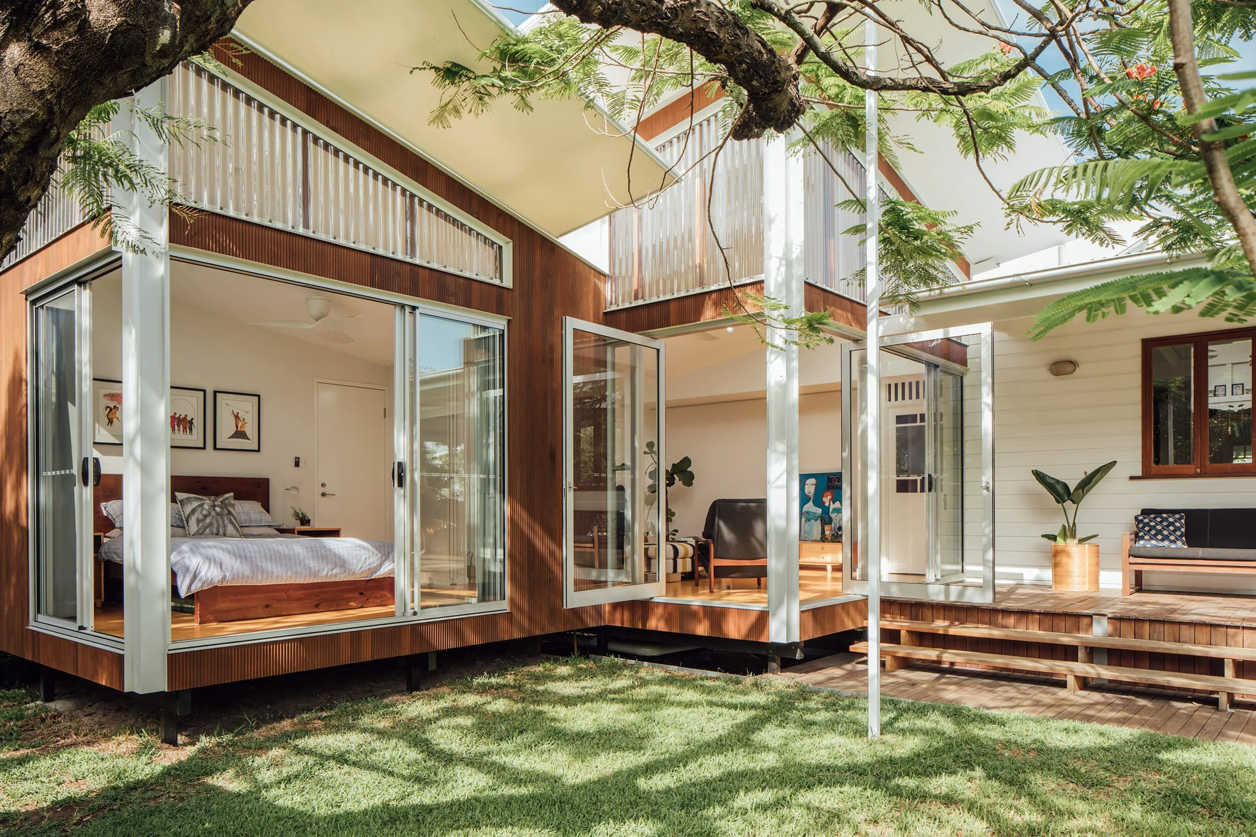 Modern house with an outdoor patio, surrounded by lush green plants and trees, with a lawn in the foreground.