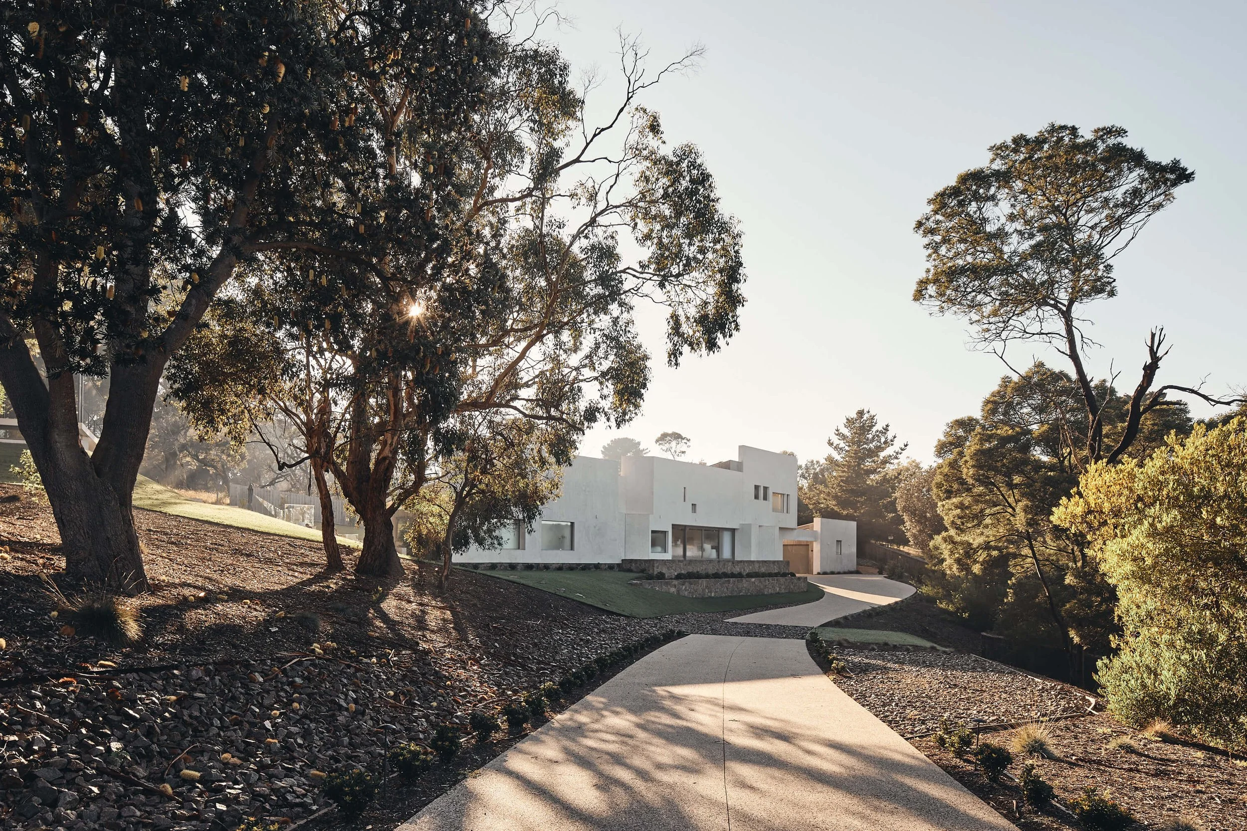 Modern two-story house surrounded by lush greenery and trees, with a grassy yard and a single chair in the foreground, under a blue sky with wispy clouds.